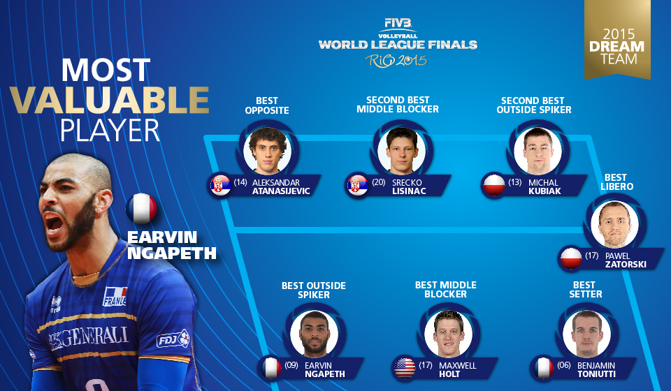 France’s Earvin Ngapeth was a decisive player for the FIVB Volleyball World League winners and received the highest individual honour in the World League Dream Team – the Most Valuable Player Award.